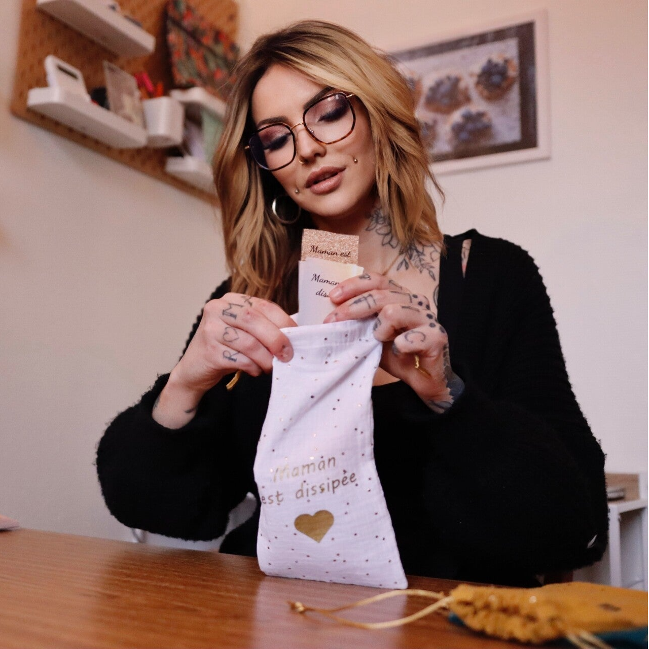 Elle est fermée par un petit cordon doré. Un marquage doré "Maman est dissipée" est présent sur le devant de la pochette.